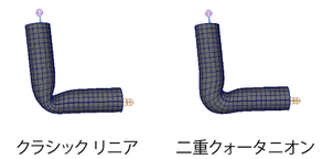 デュアル クォータニオンのスムーズ スキニング方法は、このような望ましくないデフォメーション エフェクトが作成されないように設計されています。リニア スムーズ スキニングでは、ボーンをツイストしたときにメッシュが折り畳まれるか収縮しますが、デュアル クォータニオン スキニングではメッシュのボリュームが保持されるため、このような問題が発生する領域によりリアルなデフォメーションが作成されます。
