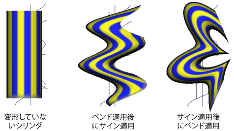 デフォメーション エフェクトはデフォーマがオブジェクトを変形する順序によって左右されるため、多種多様なエフェクトを作成することができます。たとえば、ベンド デフォーマを適用してからサイン デフォーマを適用した場合と、サイン デフォーマを適用してからベンド デフォーマを適用した場合とでは変形結果が異なります。