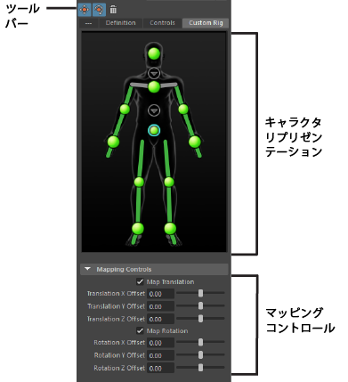 カスタム リグは通常、IK ハンドル、コンストレイント、およびその他のノードの組み合せによってドライブされます。 カスタム リグ(Custom Rig)タブには、カスタム リグをマッピングするビジュアル インタフェースや、他の HumanIK で定義されたキャラクタからデータを転送するリターゲット ツールがあります。