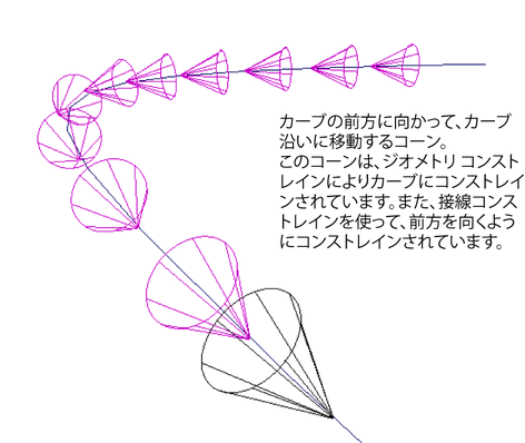 接線コンストレイントを使用すると、オブジェクトをカーブに沿って移動させたとき、オブジェクトの方向を常にカーブの方向に追従させることができます。カーブはオブジェクトが移動する際のパスになり、オブジェクトはそれ自身をカーブに沿って方向付けます。接線コンストレイントを使用すると、トラックに沿って移動するジェット コースターのような、カーブに追従するオブジェクトを簡単に設定することができます。