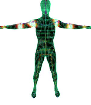 次のサンプル イメージは、インタラクティブ スキン バインド ツール(Interactive Skin Binding Tool)で既定のカラー プリセット(Color presets)の 1 つを使用したウェイト値を示しています。
