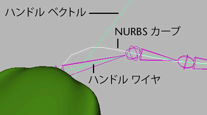 スプライン IK ハンドルでは、NURBS カーブを使用して、ジョイント チェーンのポーズを設定することができます。カーブを操作すると、ハンドルのスプライン IK ソルバは、それに応じてチェーン内のジョイントを回転させます。