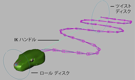 「ワークフロー例: 高度なスプライン IK ツイスト コントロールを使用して蛇をアニメートする」と「高度なツイスト コントロール(Advanced Twist Control)アトリビュート」を参照してください。