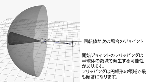 ジョイントの反転は、ジョイントの方向を回転値 0 から 90 度以上回転させたときに発生します。ジョイントの回転値が 0 となるのは、ジョイントの回転 X (Rotate X)、回転 Y (Rotate Y)、回転 Z (Rotate Z)値が(親ジョイントの回転値を基準にして)ゼロになるような位置です。反転は、ジョイントがほぼ 180 度回転したときに最も顕著になります。