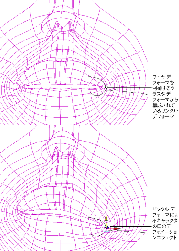 リンクル デフォーマはクラスタ デフォーマと複数のワイヤ デフォーマを組み合わせたものであるため、リンクル デフォーマをアニメートするときには、リンクル デフォーマ自体のアトリビュートではなく、クラスタ デフォーマとリンクル デフォーマのアトリビュートをアニメートします。