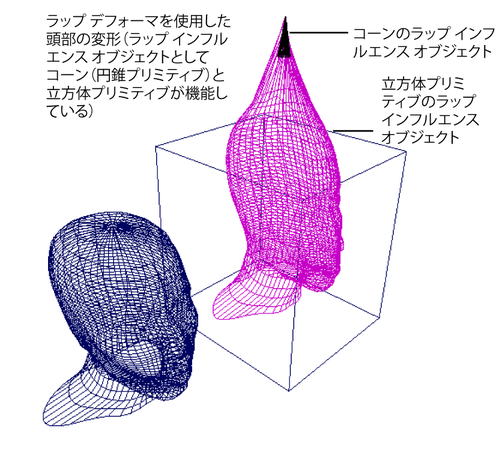 ラップ インフルエンス オブジェクトとは、オブジェクトを変形する際にラップ デフォーマ(ラップ デフォーマ(Wrap Deformer)ノード)で使用する NURBS オブジェクトまたはポリゴン オブジェクトのことです。ラップ インフルエンス オブジェクトのポイントのシェイプや変換操作によって、デフォメーション エフェクトのシェイプが決まります。