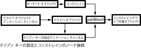 ディペンデンシー グラフ(DG)では、pairBlend ノードは、コンストレイント、キーフレーム アニメーション、およびコンストレイントとキーフレーム アニメーションの両方を適用したオブジェクト間でのリンクとして機能します。pairBlend ノードの接続は、コンストレイント ノードに接続されたすべてのターゲット オブジェクト、pairBlend ノードに接続されたコンストレイント ノードおよびキーフレーム アニメーション、またオブジェクトに接続された pairBlend ノードに似ています。