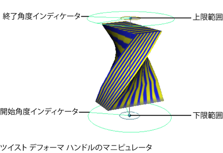 ツイスト デフォーマ ハンドル上のマニピュレータで、アトリビュートを編集することができます。