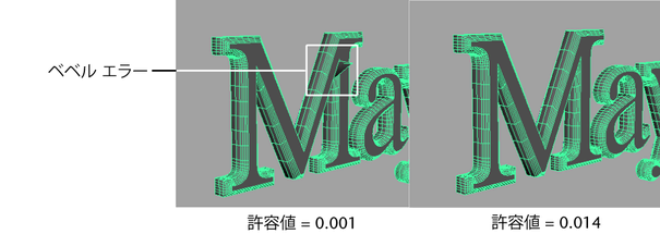 アトリビュート エディタ(Attribute Editor)の illustratorforBevel タブには、ベベルの問題の修正に役立つ許容値(Tolerance)アトリビュートが含まれています。読み込まれた Adobe Illustrator ファイルでは、カーブがラインに接している場合、その端が隣のものとわずかに異なる位置にあることがあります。これによって、ベベルがメイン カーブから外れて空中に延びる、ベベル エラーが生じます。