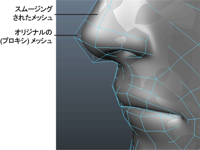 サブディビジョン プロキシを作成するときには、スムーズ バージョンとオリジナル バージョンのメッシュを同時に表示することができます。既定では、オリジナルのメッシュは、下のスムーズされたメッシュを確認できるよう、部分的に透明に表示されます。