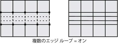 複数のエッジ ループ設定がオンの場合に作成するエッジ ループの数を指定します。既定の設定は 2 です。エッジ ループ数(Number of edge loops)を 1 に設定すると、エッジとエッジの間の中間点に 1 つのエッジ ループが挿入されます。