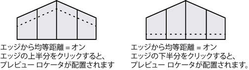 位置の保持(Maintain position)をエッジから相対距離(Relative distance from edge)(既定値)に設定すると、点線のエッジ挿入プレビュー ロケータは、選択したエッジに沿って、選択したエッジからのパーセンテージ距離に基づいて配置されます。たとえば、エッジをクリックして選択したエッジをほぼ中間までドラッグすると、点線のプレビュー ロケータは、選択したエッジ リングの他のすべてのエッジでもほぼ中間に表示されます。