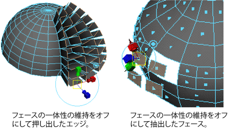 フェースの押し出し、抽出、複製を行う場合、フェースの一体性の維持(Keep Faces Together)をオンまたはオフにして、個々のフェースのエッジを維持するか、選択範囲の境界エッジに沿ったエッジだけを維持するかを指定することができます。