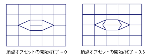 このオプションでは、選択したエッジ(または、エッジ ループ内の一連の接続されたエッジ)の両端にある 2 つの頂点を、選択したエッジ上のオリジナルの位置から内側または外側にオフセットする距離を決定します。既定のオフセットは 0 です。頂点オフセットの開始/終了(Start/end vertex offset)の単位は、選択したエッジの長さに対する割合に基づいています。