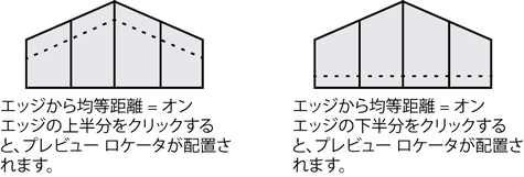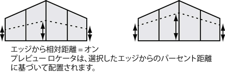 位置の保持(Maintain position)をエッジから相対距離(Relative distance from edge)(既定値)に設定すると、点線のプレビュー ロケータは、選択したエッジに沿って、選択したエッジからのパーセンテージ距離に基づいて配置されます。たとえば、エッジをクリックして選択したエッジをほぼ中間までドラッグすると、点線のプレビュー ロケータは、選択したエッジ リングの他のすべてのエッジでもほぼ中間に表示されます。