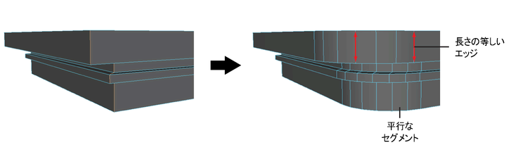 どのメッシュに対してベベル操作を実行しても、予想できる結果が生成されます。次の例では、いくつかのコーナー エッジをベベルします。すべてのベベルされたエッジの長さは等しくなり、新しいセグメントは平行になります。