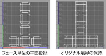 オリジナルの各フェースが平面投影を使用して投影され、ベベルによって得られた新しいフェースを取り込んだ UV が生成されます。オリジナルの UV 座標の境界は、結果的に修正されることになります。