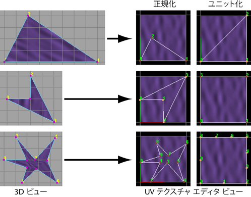 正規化(Normalize)を選択すると、テクスチャ座標は UV テクスチャ空間の 0 ~ 1 の範囲に収まるようにスケールされ、UV フェースのオリジナルのシェイプは維持されます。