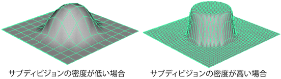 ジオメトリのスカルプト ツール(Sculpt Geometry Tool)を使用するときには、作業しているサーフェスタイプ(NURBS、ポリゴン、サブディビジョン サーフェス)に従って、頂点またはコントロール頂点(CV)のどちらかが影響を受けます。ここでは 2 つの用語を同義的に使用し、同じ影響を受けることを示しています。