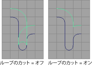 ループのカット(Loop Cutting)がオンのときは、カットの半径(Cutting Radius)の値が適用されます。カットの半径(Cutting Radius)の値が 0 より大きい場合は、ループが切り捨てられた箇所が鋭いコーナーにならず、指定の半径の円弧が作成されます。