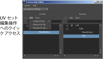 編集(Edit)メニューの UV セットの編集操作のいくつかには、リレーションシップ エディタ(Relationship Editor)からでも簡単にアクセスすることができます。