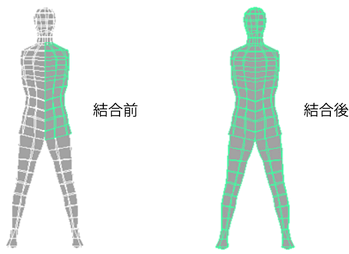 結合(Combine)機能を使用して、2 つ以上のポリゴン メッシュを 1 つのポリゴン オブジェクトに統合することができます。結合(Combine)機能は、作成される新しいポリゴン メッシュ ノードのポリゴン シェルとしてメッシュを構築します。統合されたメッシュのトポロジは、他の方法では修正されません。