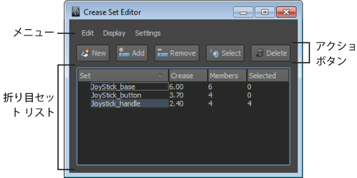 折り目セット エディタ(Crease Set Editor) ()では、シーン内の折り目セットを作成および管理できます。