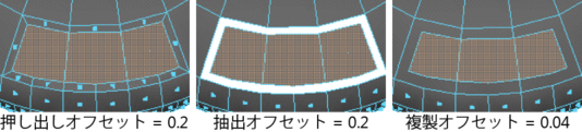 - 抽出したフェースのエッジをオフセットする値を入力します。押し出したフェースのオフセットと複製したフェースのオフセットについても比較のために、説明しています。このオプションを選択すると、押し出したフェースに対してベベル効果を生成したり、抽出(Extract)を使用してフェースの周囲を切り抜いたり、複製したフェースを均一にスケールしたりすることができます。