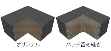 パッチ(Patch)に似ていますが、バベル エッジの頂点をバベルされていないエッジの頂点に接続するのではなく、コーナーに円弧が作成されます。