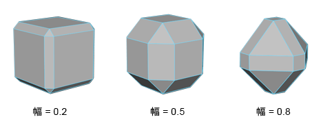 オフセット タイプ(Offset Type)が割合(Fractional)の場合、幅(Width)の値は 0 ~ 1 の範囲に制限されます。幅(Width)の値を 1 に設定すると、その距離はベベルが裏返しにならない最大限の距離になります(最も短いエッジを基準として)。幅(Width)の値が 1 より大きいときには、ベベルが裏返しになります。