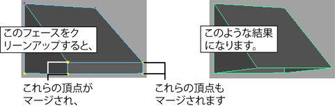 一部のポリゴン編集操作を使用してポリゴン メッシュを修正すると、不適切なアトリビュートを持つポリゴン フェースが生成されることがあります。たとえば、4 辺のフェース、5 辺以上のフェース、凹型フェース、穴のあるフェース、非平面フェースなどです。これらのオプションを使用すると、不適切なフェースをテッセレーション(三角化)することにより、こうした問題をクリーンアップすることができます。