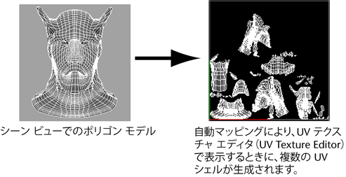 自動マッピングにより、複数の UV マップ ピース、つまりシェルがテクスチャ空間に作成されます。投影モードの標準的な(コームしていない)ファーや 3D ペイント ツール(3D Paint Tool)のような、UV を自動的に処理するツールを使用する場合、自動マッピングは非常に便利です。UV を手動で操作する必要がある場合、移動して UV エッジの縫合(Move and Sew UV Edges)機能を使用して、UV エディタ(UV Editor)で UV シェルを 1 つにまとめてステッチする必要があります。