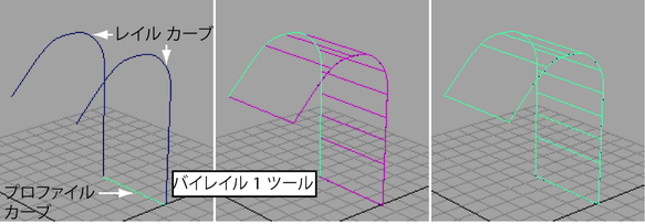 プロファイル カーブとして使用するカーブをクリックし、次にレイル カーブとして使用する 2 本のカーブをクリックします。