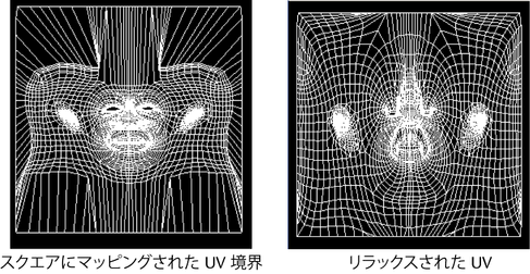 UV を最適化すると、メッシュ状の UV の間隔が均等になり、歪みのある領域が固定されます(オーバーラップ UV)。たとえば、UV 境界のマップ(Map UV Border)コマンドと組み合わせて内側の UV のもつれをとくことができます。初めに UV を境界(正方形または円)にマッピングすると、UV の空間外でも UV をリラックスさせることができます。