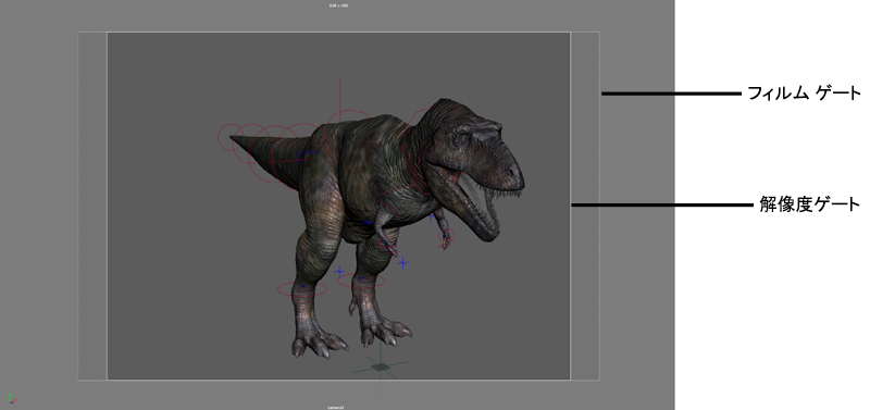 解像度ゲートは、レンダリング解像度(レンダーされる領域)を表します。フィルム ゲートは、カメラのアパーチャの寸法を表します。この例では、解像度ゲートは 4:3 のアスペクト比に、フィルム ゲートは 16:9 のアスペクト比に設定されています。この図は、解像度ゲートでフィルム ゲートを切り取れることを示しています。これらのビュー ガイドを表示し、レンダー出力内のオブジェクトが必要に応じてズームまたはフレーミングされていること、および最終レンダリング イメージから切り取られているオブジェクトがないことを確認します。