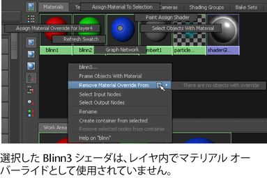 マテリアルがマテリアル オーバーライドとして現在使用されていない場合は、マテリアル スウォッチを右クリックしてマテリアル オーバーライドの除去元(Remove Material Override From)を選択すると、メニューに「オーバーライドするオブジェクトはありません(There are no objects with override)」と表示されます。