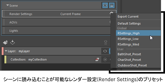 レンダー設定 > プリセット(Render Settings > Presets)メニューまたはレンダリングの設定(Render Setup)エディタの