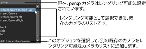 シーン を 1 つのカメラ(のみ)からレンダーしている場合は、カメラをプルダウン リストから選択します。既定では、perspShape カメラがレンダリング可能なカメラです。