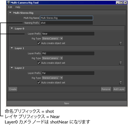マルチカメラ リグと各レイヤの命名プリフィックスを入力します。各レイヤのメイン ノードに、<Naming Prefix Layer Prefix> という名前が付けられます。たとえば、既定ではレイヤ 0 には shotNear という名前が付けられます。