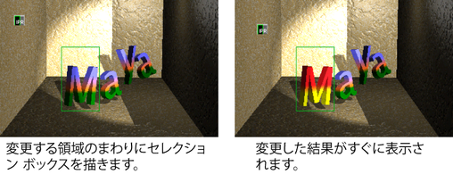 - ライティングやテクスチャなど、特定の要素だけを変更して、ビューは変更したくない場合は、更新するオブジェクトまたはその一部の周りだけにセレクション ボックスをドラッグします。結果はレンダー ビュー(Render View)にすぐに表示されます。