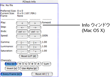 FCheck Info ウィンドウは、Mac OS X に固有のものです。これを使用してイメージやアニメーションを制御および変更します。