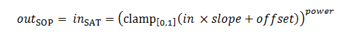 ASC CDL トランスフォームは、各 RGB チャネルに個別に適用される slope-offset-power (SOP)関数と、その後ですべてのチャネルに均等に適用される saturation 関数で構成されています。