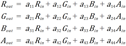 | "4 5 4" | RGBA 値の 4 x 5 行列操作 バージョン 1.3 で導入されました。 |