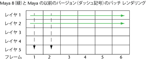 Maya の旧バージョンのコマンド ライン レンダリングでは、フレームの各レンダー レイヤが次のフレームに移動する前にレンダーされました。