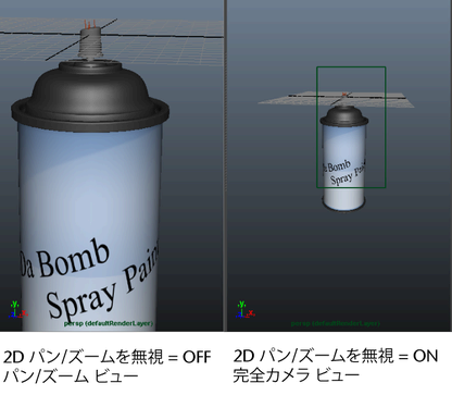 2D パン/ズーム(2D Pan/Zoom)機能では、既定ではレンダーを行いません。パン/ズームされたビューをレンダーするには、カメラ アトリビュート エディタ(Camera Attribute Editor)の表示オプション(Display Options)セクションにある 2D パン/ズーム(2D Pan/Zoom)サブセクションで、パン/ズームのレンダー(Render Pan Zoom)を有効にする必要があります。