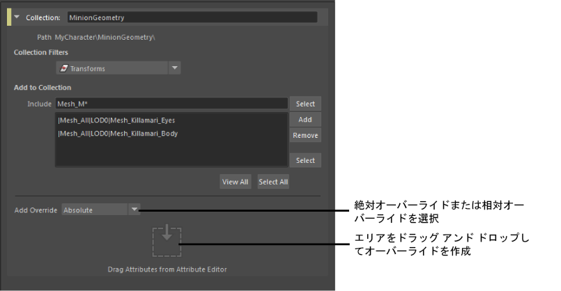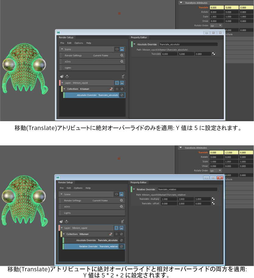 たとえばこの例では、移動(Translate) アトリビュートをドラッグしていますが、これは Mesh_Killamari_Body トランスフォーム ノードの特定の移動(Translate)アトリビュートではありません。したがってオーバーライドは、Mesh_Killamari_Body だけでなく、移動(Translate)アトリビュートを持つコレクション内のすべてのオブジェクトに適用されます。