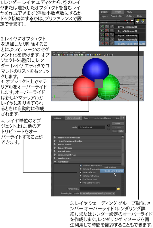 レイヤ オーバーライド単位またはオブジェクト オーバーライド単位のシステムでは、オブジェクトの異なるシェーディング アトリビュートとレンダリング アトリビュートを別々のレイヤに設定できます。