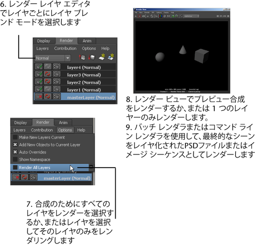 レンダー レイヤを使用すると、それぞれ異なるマテリアルを持つ複数のレイヤに任意のオブジェクトを割り当てることができます。これによって、Maya の 4 つのレンダラ、サード パーティのプラグイン レンダラと、Fur や Paint Effects などのポスト プロセスを自由に組み合わせて、フレームごとに複数のイメージを作成することができます。レンダーしたイメージは、合成ソフトウェアへの出力用に効率的に構成することができます。レンダー レイヤは、複数のイメージ レイヤをサポートする Adobe® Photoshop® (PSD)フォーマットでレンダーすることもできます。