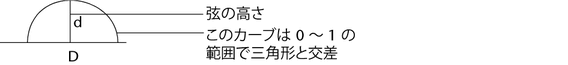 弦の高さ(Chord Height) (d)と、三角形がサーフェスと交差する 2 点間の距離(D)との比(d/D)を計算し、1 からその比を差し引きます(次の式を参照)。