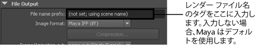 レンダー設定(Render Settings)ウィンドウ:共通(Common)タブでレンダー トークンを使用してファイル名プリフィックスを設定する以外に、コマンド ラインで -im フラグを使用してファイル名プリフィックスを設定することもできます。それぞれのレンダー トークンに各括弧を含め、文字列をクォーテーション マークで囲む必要があります。レイヤを示す %l、カメラを示す %c など一部の簡単な表記法は、下位互換性を保つために引き続きサポートされます。ただし、すべてのトークンに簡単な表記法があるわけではありません。 サブディレクトリを作成するには、/ (スラッシュ)を追加します。アンダースコア(_)とダッシュ(-)に加えて、英数値テキストもイメージ ファイル名でトークンを区切るのに使用できます。